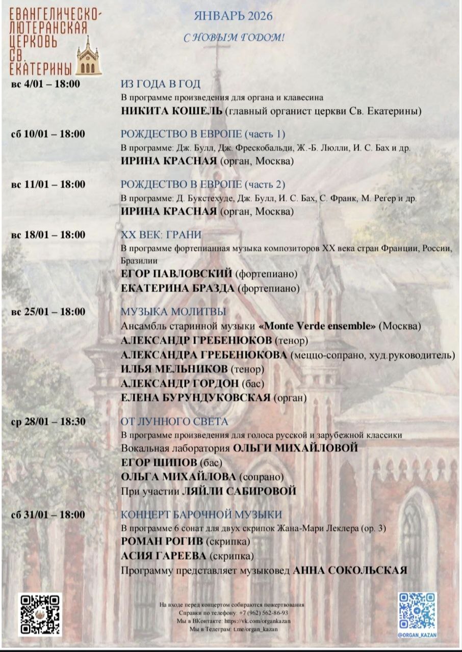Лютеранская кирха — единственное место в Казани, где сочетаются атмосфера действующей церкви, звучание настоящего небольшого духового механического органа и копии старинного клавесина. Концерты проходят здесь согласно многовековой традиции, открывающей всем желающим (вне зависимости от убеждений и взглядов) возможность приобщиться к культурному наследию.